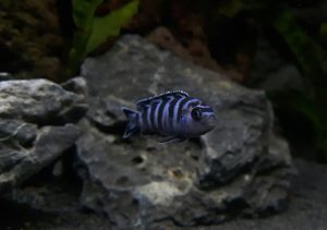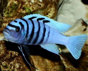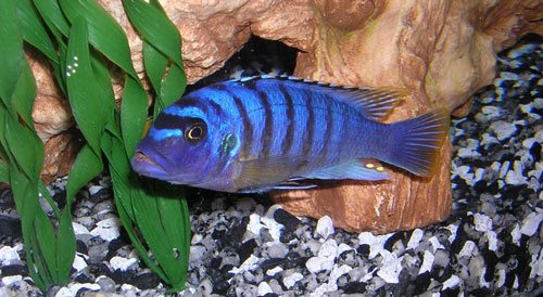 Псевдотрофеус зебра. У этого вида можно встретить несколько вариантов окраски — черно-белую, голубо-черную, голубую и оранжевую. В цветовой форме с голубыми и черными полосами рыбы внешне напоминают