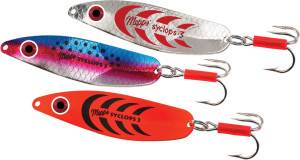 Mepps Cyclops – также имеет свой уникальный контур корпуса для неповторимых колебаний, имитирующих живую рыбу. Цвета разнообразные, классические: золото, серебро, медь, а также яркие и разноцветные «кислотные».