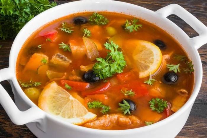 Выложи томатную зажарку в бульон и доведи до кипения. Добавь рубленые огурцы, маслины, оливки, зелень и каперсы, провари все еще 15 минут на слабом огне, верни в кастрюлю кусочки сазана и сними с плиты.