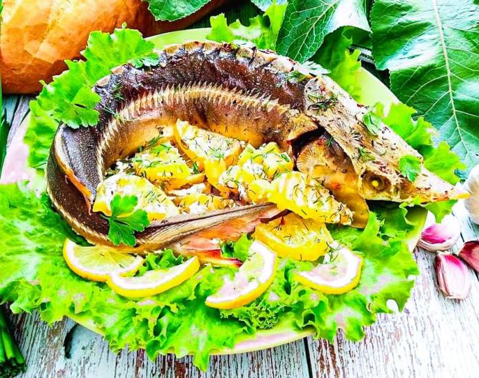 Стерлядь готова! Переложите ее на поднос, украсив зеленью и дольками лимона. Рядом можно подать картошку в качестве гарнира. Приятного аппетита!