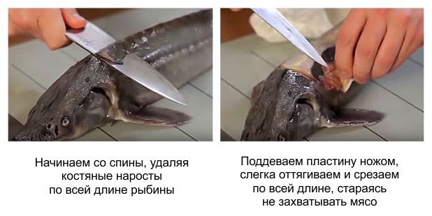 - Стерлядь очищаем от слизи, отрезаем голову, хвост и крупные спинные плавники, а также убираем мелкие плавники с брюшка и боков, делая надрезы со стороны хвоста.