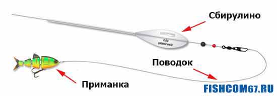 Грузило (грузило должно удерживать живца на выставленной глубине) и двойник или тройник на поводке. Поводок в диаметре должен быть в пределах 018-020 мм, этого вполне достаточно при грамотном вываживании трофейного экземпляра.