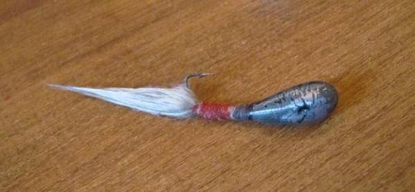Приманка почти готова. Остается лишь закрепить на тройнике шерстяное оперенье, определить центр тяжести, просверлить отверстие диаметром до 2 мм и протестировать ее в воде.