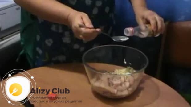 Разрезаем мясо на небольшие кусочки, выкладываем в глубокую емкость. Сразу добавляем мелконарезанный чеснок, уксусную эссенцию, соль. Перемешиваем и отправляем на несколько часов в холодильник мариноваться. Лучше оставить на ночь.