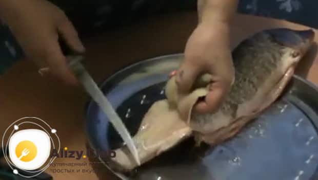 Промойте щуку под проточной водой и удалите чешую ножом. Отрежьте голову, хвост, плавники и кишечник. Ножом разрежьте гребень и руками разделите его на две части