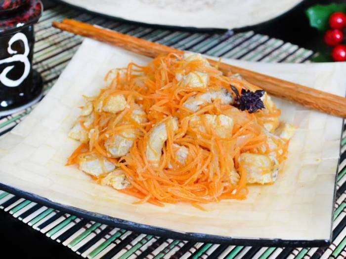 На этом этапе готовим морковь. Его необходимо очистить от кожуры и нарезать тонкой соломкой или натереть на специальной терке. Когда рыба будет мариноваться в течение нужного времени, добавьте смесь моркови и перца. Хорошо перемешайте и поставьте в холодильник на 1-2 часа.