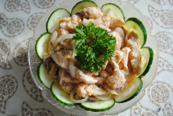 Выкладываем в салатницу, хе из щуки с грибами и огурцом готово.