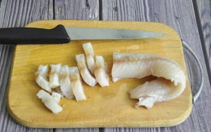 Нарезать рыбное мясо на кусочки шириной примерно 1 см и отправить в чашу.