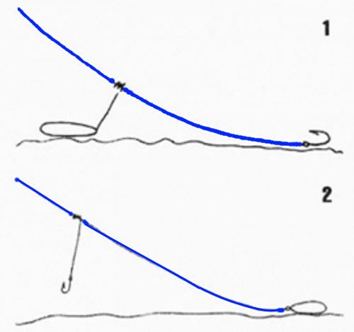 На схеме выше изображено два варианта монтажа оснастки. Первый предусматривает крепление поводка ниже грузила, чтобы он лежал на дне во время ловли, а второй вариант предусматривает монтаж поводка выше грузила, чтобы он висел в воде и подыгрывал на течении. Говорить об эффективности первого или второго варианта сложно. При рыбалке в разных условиях монтажи проявляют разную эффективность.