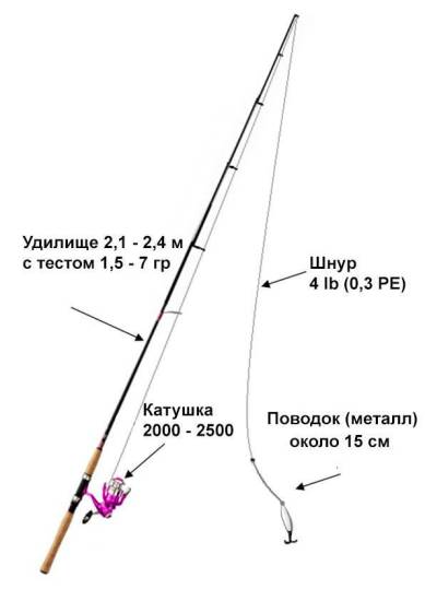 - спиннинг длиной 2,1–2,4 м и тестом бланка 1,5–7 г;