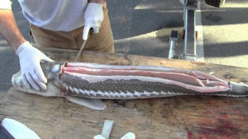 - Теперь можно убрать внутренности. Если вам посчастливилось найти икру, отложите ее для маринования. Икра стерляди относится к черной икре — известному деликатесу.