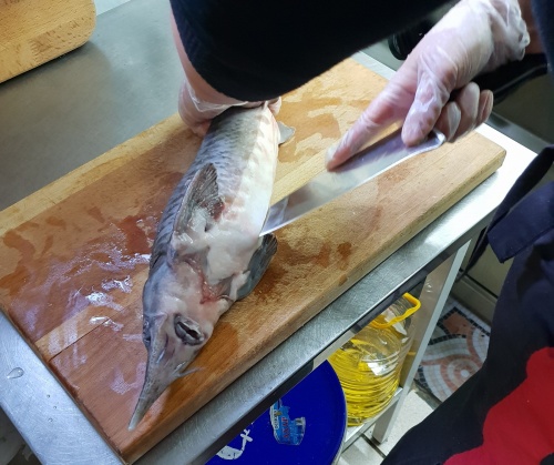 - А вот если компонент нужно будет нарезать перед термической обработкой, засаливать или мариновать, придется дополнительно провести еще несколько манипуляций. Чешуи о осетра нет, а его кожа похожа на наждачную бумагу. Сначала особь выкладываем в дуршлаг и ошпариваем кипятком. Затем вспарываем ей брюшко и извлекаем все внутренности. Промываем заготовку холодной водой, удаляя сгустки крови. Икру или молоки извлекаем и засаливаем.