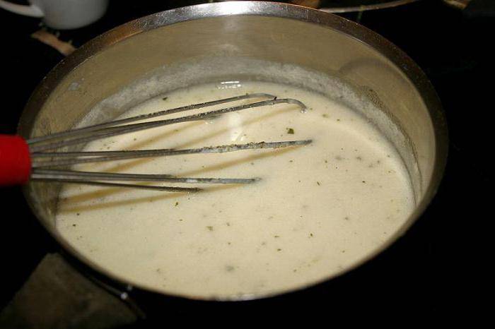 Шаг № 5. Делаем соус. Измельченный кубиком лук обжариваем в горячей сковороде, применяя масло. Туда же всыпаем муку. Жарим чуть меньше минуты. Вливаем рыбный бульон и сливки. Солим. Добавляем сацебели, измельченный укроп, хмели-сунели и любимые специи. Продолжаем ингредиенты в течение 5-10 минут, постоянно их помешивая.