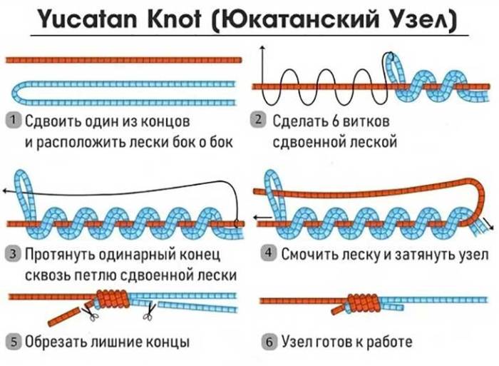 Такой узел хорошо для связываний между собой лесок разного типа. Назван он в честь полуострова Юкатан, где был впервые использован на соревнованиях по спортивной рыбалке. Удачный вариант узла для привязывания монофильного или флюорокарбонового поводка к плетенке. Считается, что это один из самых крепких узлов, его прочность на разрыв составляет 83% от прочности самой лески. Многие даже считают его прочнее Олбрайта, не говоря уже об остальных.