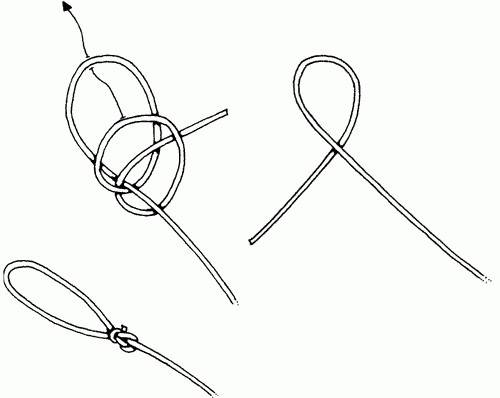 - конец лески стоит пропустить сквозь образованный узел, не затягивая его;