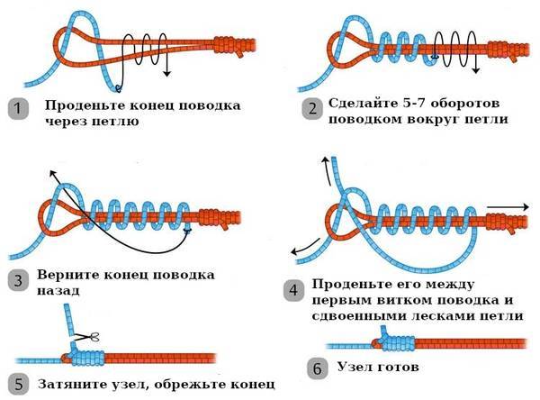 - В ушко вертлюжка протягивается леска, затем создаётся кольцо. Приставляем его к основной леске и вокруг главной лески обматываем, проводя край через кольцо 6 раз, на седьмой раз обматывается без кольца, а затем обратно в ушко петли, и затягивается.