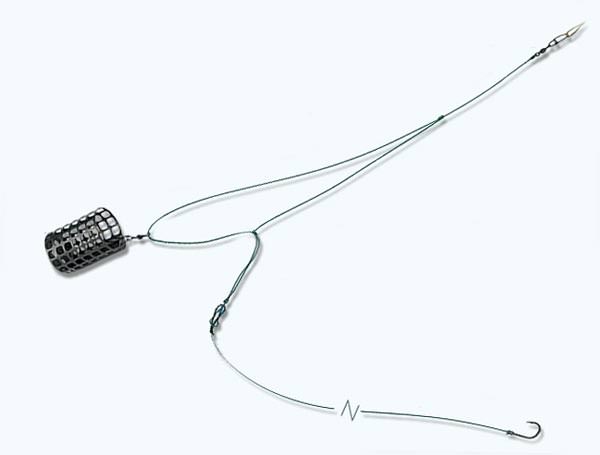 - На основную леску крепится и фиксируется грузило-кормушка, после чего на конце основы формируют вторую узловую петлю.