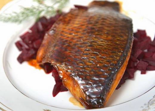 - Довести до кипения свекольный соус. Добавить в соус мускатный орех. Выложить на тарелки горячую рыбу сиг, залить также горячим свекольным соусом.