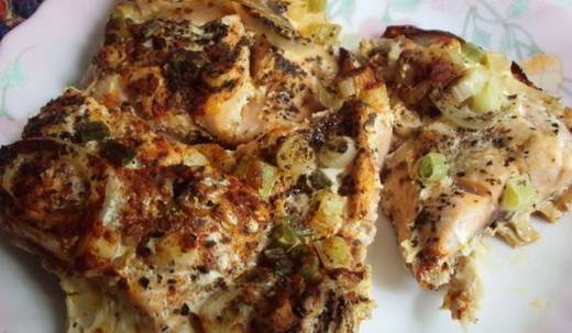 В миску кладут рыбу, добавляют соль и черный перец по вкусу, смешивают. Добавляют пару лавровых листов, кольца лука, а также дольку чеснока, пропущенную через пресс. Все снова смешивают, посыпают небольшим количеством приправы «Хмели-сунели». Добавляют растительное масло, все встряхивают, накрыв миску крышкой. Подготовленную рыбу убирают на холод на пятнадцать минут. Перед употреблением ее снова встряхивают.