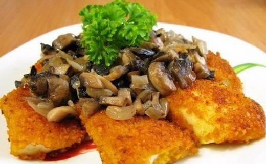 - Рыбу порежьте на порционные куски, посолите, поперчите, обваляйте в муке и обжарьте на масле. Сыр натрите. Грибы порежьте пополам или на 3 части, если большие. Кабачки порежьте кольцами и слегка обжарьте на сливочном масле вместе с грибами.