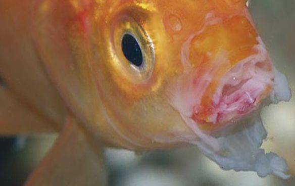 На первых этапах патологии около рта рыб формируются образования серого цвета. Такую же картину можно наблюдать на голове, жабрах и плавниках. В запущенном случае в область поражения вовлекается внутренняя поверхность ротовой полости.