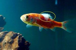- Кроме того, на кожном покрове рыбки появляются образования, похожие на кровоподтеки, имеющие тонкую кайму по краю, распространение которых постепенно приводит к разрушению верхнего кожного покрова. Открытые ранки, как правило, поражают грибки.