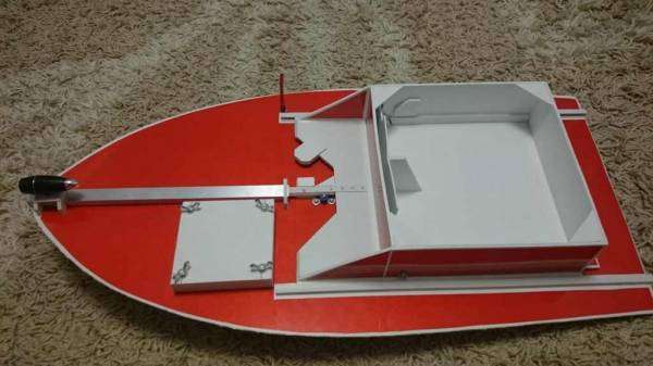 - На корме устанавливаются деревянные рейки, к которым крепятся двигатели, электроника и антенна. Двигатель с дном катера должен образовывать угол примерно в 10 градусов.