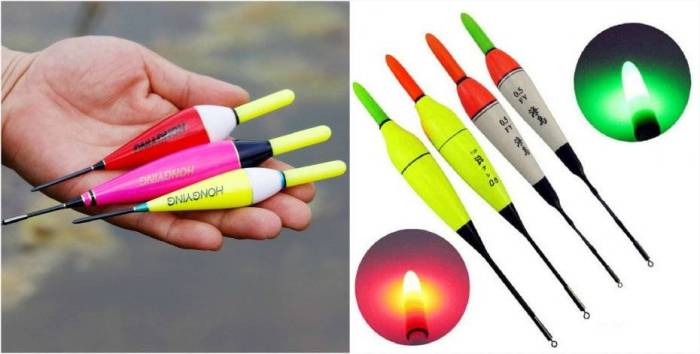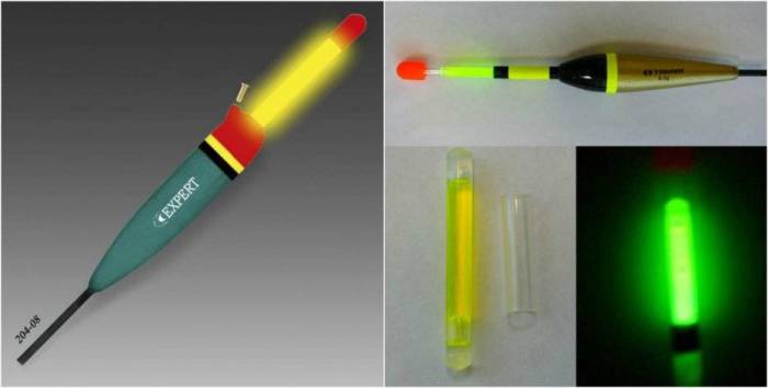 Светящийся, или поплавок-светлячок. В конструкцию светящегося поплавка входит прозрачная трубка с капсулой и двумя реагентами в жидком состоянии. После того, как эти два вещества вступили в реакцию, поплавок начитает мягко светиться. Светлячок закрепляется на антенне обычного поплавка. Срок его действия продолжается около 10 часов.