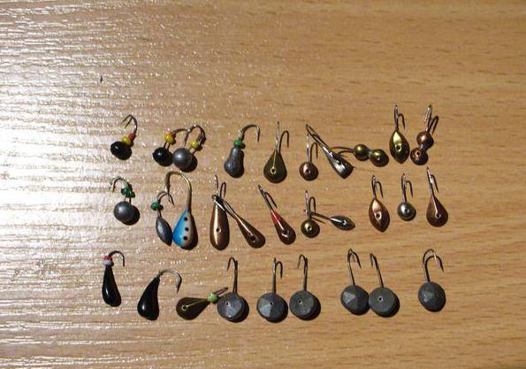 Хорошо клюет на мормышки средних и больших размеров весом до 12 грамм. Это всевозможные «жучки», в основном округлой или овальной формы и еще на медную рыбку красного цвета длинной от 15 до 25 мм. Крючки берут под номерами 4-8. Еще всегда берут обычное удилище, спиннинг и донку с обычным поплавком, для чего они понадобятся, будет рассказано после.