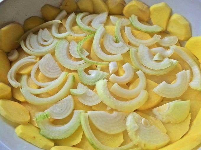 Сложите заготовки в форму. Отправьте в горячую духовую печку. Запекайте полчаса. Температурный режим 180°С.