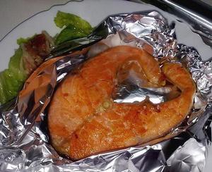 Одна из самых простых и легких форм приготовления рыбы в духовке. Завернуть предварительно стейки лосося свежего или замороженного в фольгу. Полить соком лимона на стейки, посыпать солью и перцем. Запечатать хорошо фольгу и запекать лосося на протвине в духовке. Когда алюминиевая фольга вздуется, этот момент говорит о том что лосось готов.