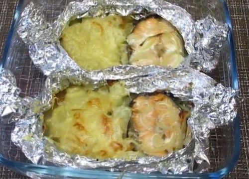 Поставьте обратно в духовку на четверть часа. По готовности подавайте на стол. Запеченный в фольге лосось вкусней всего горячим.