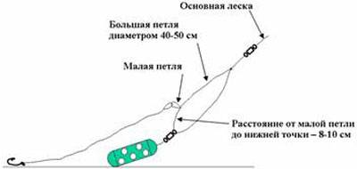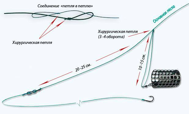 Важно помнить, что для плотвы не стоит делать первую петлю длинной, достаточно 7–12 см. Поводок крепится способом «петля в петлю» ко второй петельке, длина поводков небольшая — максимум 30 см