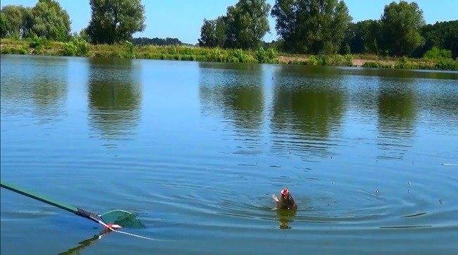 Поклёвка была уверенная, что меня удивило. Рыба, обнаружив насадку, сразу её заглотила. Фрикцион катушки затрещал. В считанные секунды 15 метров плетёнки исчезло под водой. Держу удилище в натяг, регулируя фрикционом, что бы рыбе не дать слабину. Карп мотался из стороны в сторону, пытаясь увести снасть в густую водную растительность. Я старался делать всё правильно, чтобы рыба не сошла, потому что второго шанса сегодня поймать карпа, может и не быть. Борьба затянулась более чем на 10 минут. Несмотря на мощь карпа, рыба стала понемногу уставать и сдавать «позиции». Когда до вываживания трофея на берег оставалось 2 — 3 метра, я взял в руки подсачек и медленно подвел под карпа. Рыба, как дрессированный зверь, послушно в него зашла. Есть! Наконец-то первый карпик!