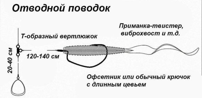 В некоторых типах джиговых оснасток применяют поводки из флюорокарбоновой лески толщиной 0,28–0,33 мм. Их длина может варьироваться от 30 до 120 см.