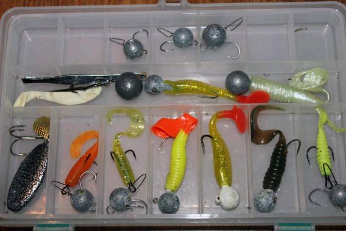 При джиге применяют мягкие приманки с разными головками, чаще выглядят как маленькая рыбка. Она изгибается как настоящая добыча. Представлены наживки в различных вариантах формы и цветов. Кроме силикона используют блесны, отличающиеся по весу и размеру.