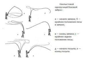 Все забросы представляют собой волнообразные движения шнуром. Их условно делят на основные (горизонтальные, вертикальные, кольцевые), усложненные (волнообразные, выпрямляемые, вытягиваемые, дуговые и др.) и специальные (меняющие направление, с изгибом, двойным подтягиванием шнура, под бланком и др.). Методика заброса следующая: