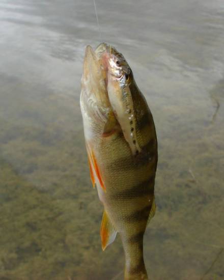 Но не менее интересна ловля окуня поплавком. Ловят его в ямах, у мостов и свай, на каменистом дне, у зарослей травы и прочих местах, которые для окуня интересны с точки зрения охоты и маскировки. Как правило, на поплавочную снасть ловят со дна, наживка — обычный червь (можно и мотыля, хотя летом это менее актуально). Мы не ставим поводок при ловле окуня, леска подойдет около 0.2 мм., можно чуть тоньше. Кстати, саму поплавочную оснастку можно смонтировать в нескольких вариантах: по типу донной снасти и как обычную поплавочную снасть. Крючок лучше использовать с длинным цевьем, так как и извлекать его будет удобнее, да и, в случае необходимости, можно насадить и пару червей. Как ни странно, но на опарыша, в нашей практике, окунь шел как-то не очень активно.