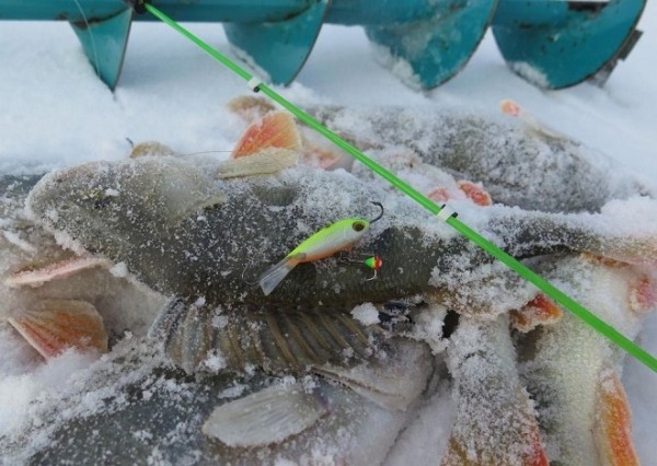 Помимо блесен и балансиров, полосатый активно отзывается на приманки с креплением лески за спинку – безлопастные воблеры (ратлины, вибы) и цикады. Такие приманки для ловли окуня по первому льду целесообразно применять на средних и больших глубинах, а также при целенаправленном поиске крупного горбача. На относительно крупный ратлин (по отношению к окуневым блеснам) легко может взять и судак, и щука.