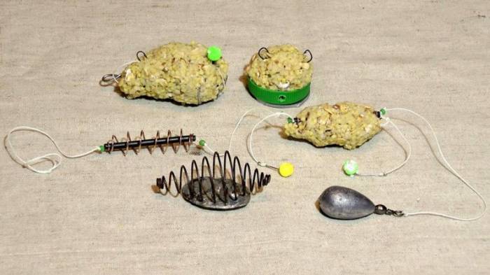 Установка кормушки отличается от стандартной: ее фиксируют на главной леске прочно, не применяя каких-либо петель. Наилучшая форма кормушки — открытая пружина, где груз расположен внизу. Такая форма позволит корму находиться сверху. Масса кормушки с прикормкой не должна быть больше 140 г.