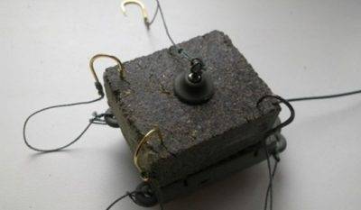 Для оснастки донки на конце лески закрепляется плоское грузило. Выше груза крючки на поводках. Достаточно 4-х штук. Под плоским грузилом закрепляется брикет жмыха, по углам которого заводятся крючки. Рассасывая жмых, сазан обычно самоподсекается. Для вываживания крупной рыбы выбором лески руками, необходимо предусмотреть перчатки.