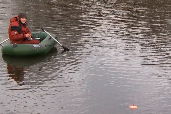 Подход к сработанному кружку делают осторожно, стараясь вёслами не пугать взявший живца трофей. Подбирают сам пенопластовый диск, впоследствии начиная забрасывать в лодку высвободившийся шнур