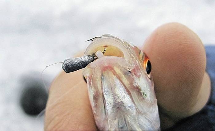 Чертик монтируют напрямую к леске. Многие приманки обладают специальным пропускным колечком, другие – имеют отверстие в теле. Вольфрамовые искусственные насадки лучше подбирать с кольцом, поскольку плотный металл легко режет мягкий зимний нейлон.