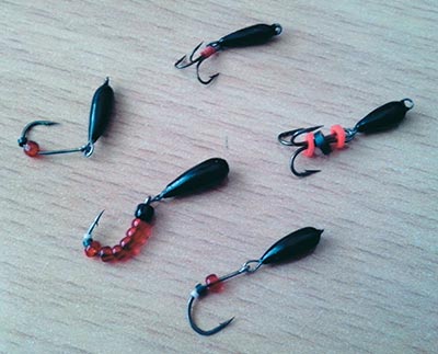Длина тела этой мормышки не превышает 10 мм при диаметре не более 3 мм, крючки, как правило, используются не крупнее № 16. С увеличением размера крючков количество поклевок резко сокращается. Крючки могут быть оснащены разноцветными кембриками или бисером, но это вовсе не обязательно — рыба отлично клюет и на голый крючок.