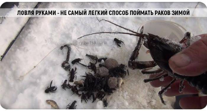 Зимой раков ловят с помощью специальной раколовки, зимних удочек и даже руками. Применяя стандартные техники, на льду проделывают несколько отверстий, чем больше, тем лучше.