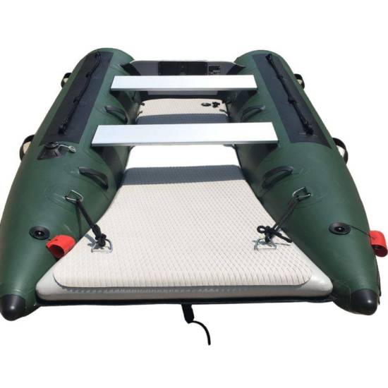 - Надувной днищевой настил. Состоит из герметичной полимерной ткани, обеспечивающей высокую жесткость и надежность полу. Используется с моторами от 5 л.с. и выше. Можно применять в качестве матраца для плавания либо сна в палатке.