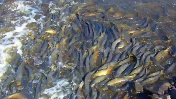 - На мелководье появляется несколько экземпляров рыб – так происходит разведка, за несколько дней предваряющая уход на нерест остальных рыб. После этого происходит валовой нерест. Ведут группу рыб самки карпов и сазанов. Особенно такое поведение типично для карпа, обитающего в реках.