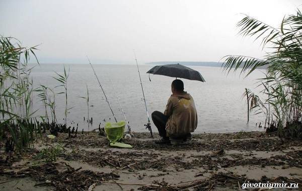 Здесь водится плотва, лещ, красноперка, судак, окунь и голавль. Но особенно хорошо клюет зачетная плотва. Была середина лета, и плотва клевала слабо, видимо, была сытой. И тут засверкали молнии, начал накрапывать мелкий дождь, чувствовалось, что скоро будет ливень и гроза.