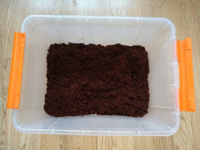 - Теперь берем в ладони часть субстрата, хорошенько его отжимаем таким образом, чтобы с него не текла вода, но и не нужно, чтобы он был совсем сухим. Отжатый субстрат выкладываем на дно террариума. Наш грунт готов.