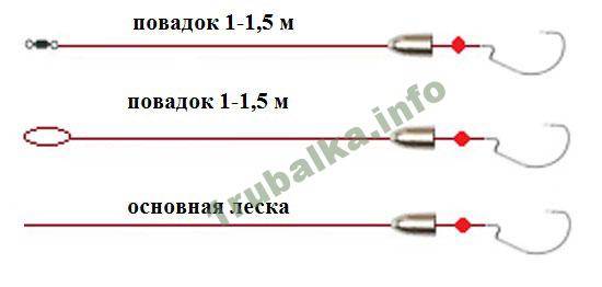 Длина поводка обычно в среднем составляет 1,2- 1,5 метров. Но когда рыба капризничает, ставят короткий поводок до 50 см, либо увеличивают его до 2 метров.